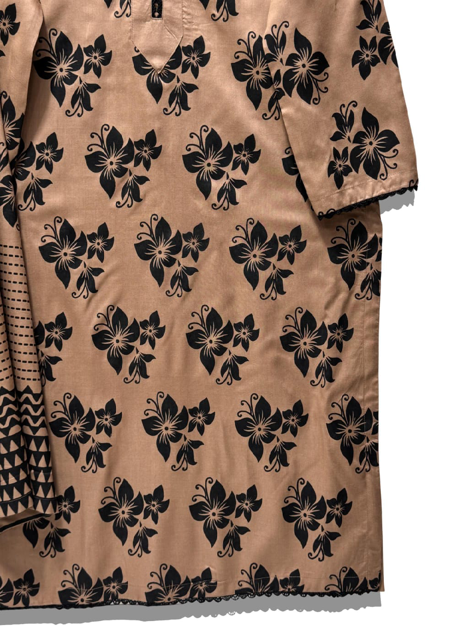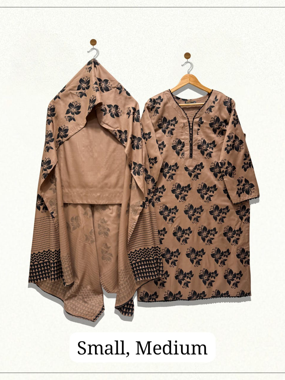 A chic 3-piece linen suit featuring a beautifully screen-printed shirt, a matching screen-printed dupatta, and a plain plazo for a clean, graceful finish.