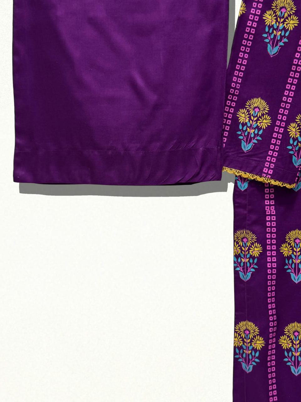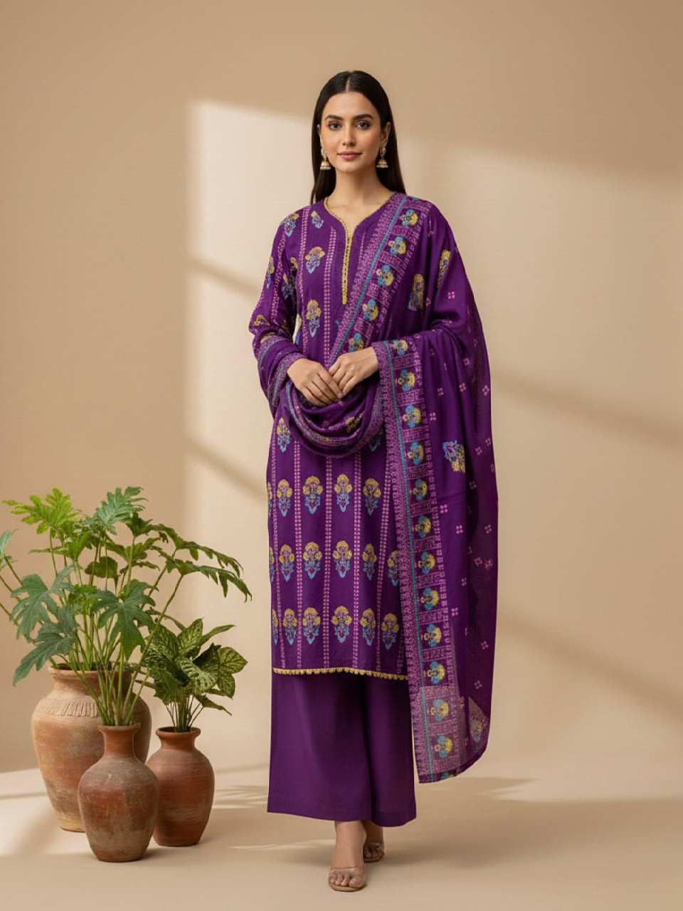 A chic 3-piece linen suit featuring a beautifully screen-printed shirt, a matching screen-printed dupatta, and a plain plazo for a clean, graceful finish.